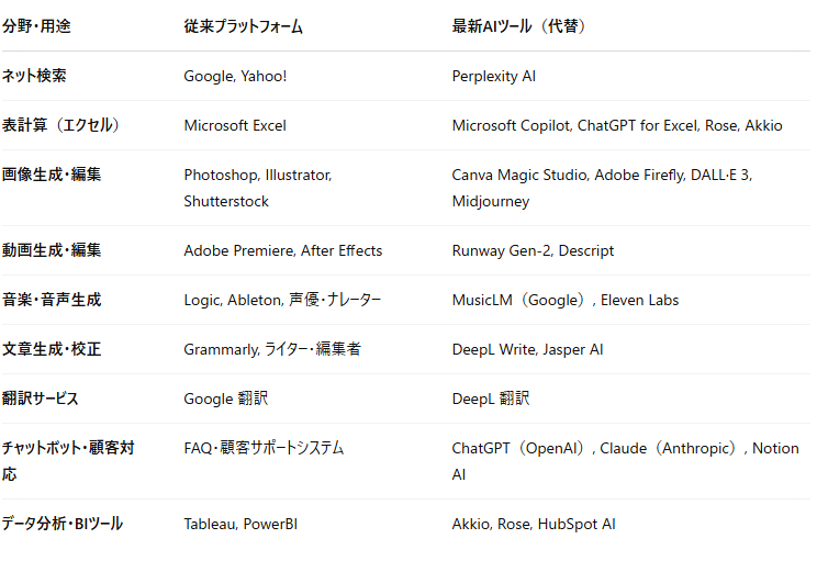 各AIツールは従来型のプラットフォームの弱点を補完し、作業の効率化や高度化を実現しています。